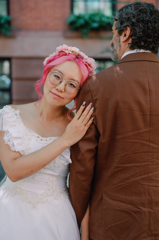 Emma and Frank did exactly that. It was a two-day celebration, and every moment was one of a kind. Dress, flowers, and hair were all made by their friends and customised to Emma’s love for cats. The first day was an elopement day in Court House in Brooklyn, followed by a photoshoot in Brooklyn Heights and the Cat Cafe. The second day was a party at the Zombie bar with family and friends. Everything was done with the intention of honoring Emma and Frank’s journey.
